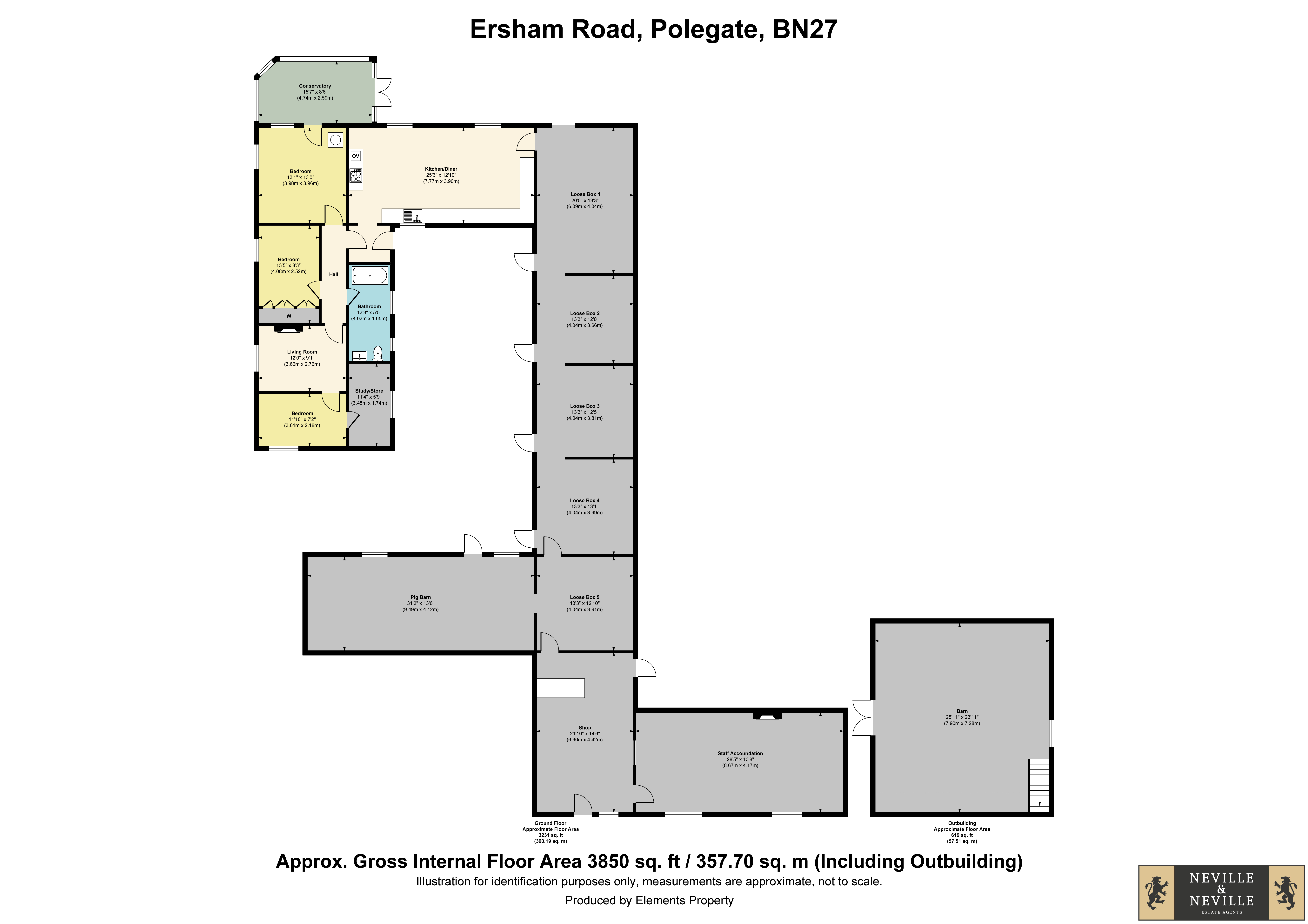• Main residential part of the main house comprises of 3 bedrooms, living room, study, conservatory, family bathroom, kitchen diner and conservatory